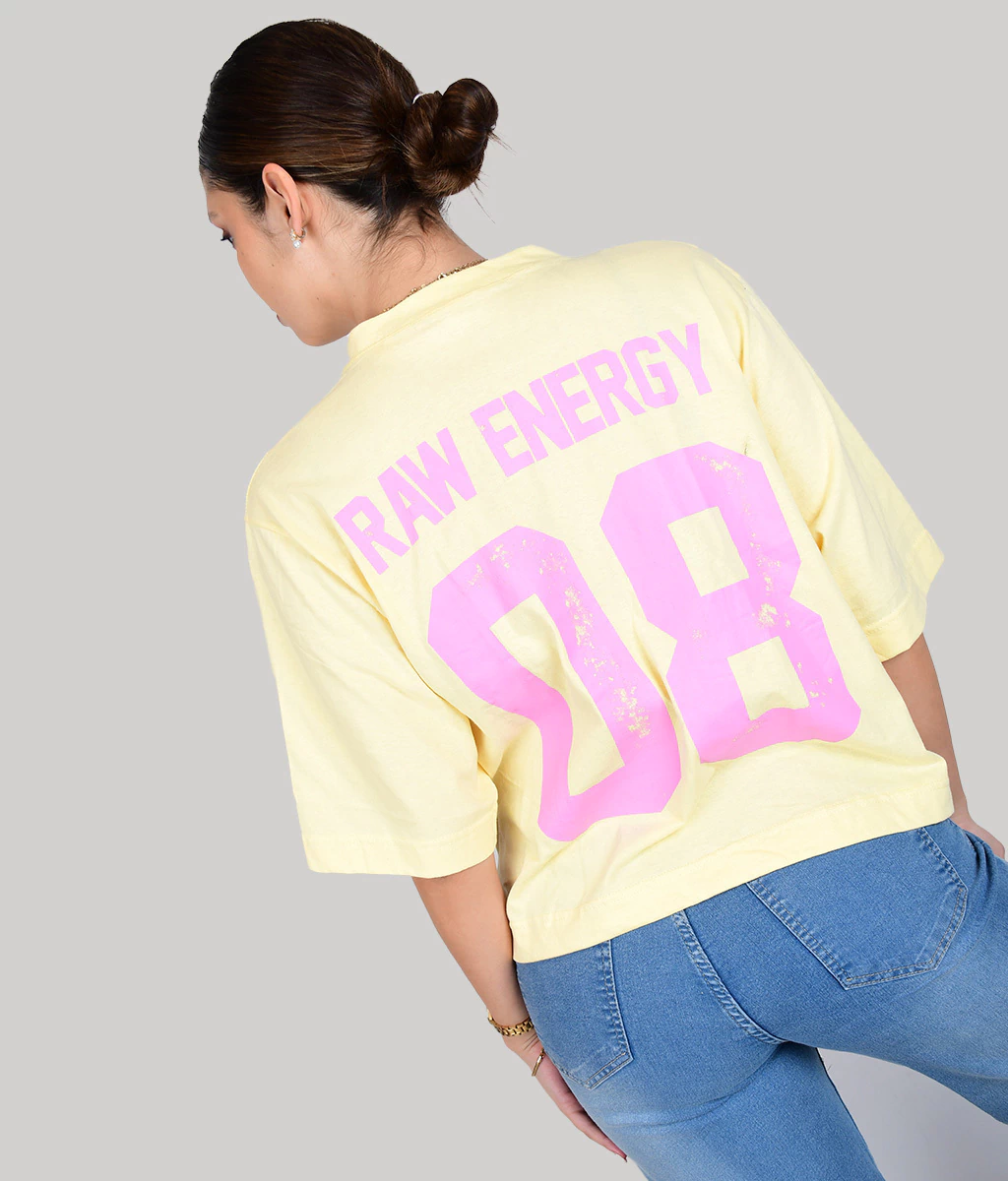 REMERA BOXY DE ALGODON MANGAS CORTAS CON ESTAMPA AL FRENTE, ESPALDA Y CUELLO REDONDO.