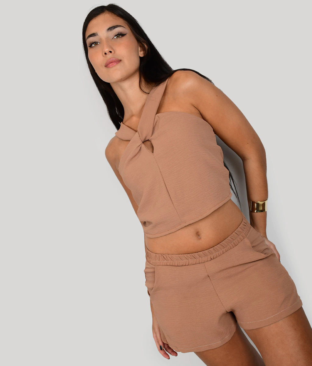 SHORT DE CEY CON ELASTICO EN CINTURA Y BOLSILLOS A LOS LADOS.