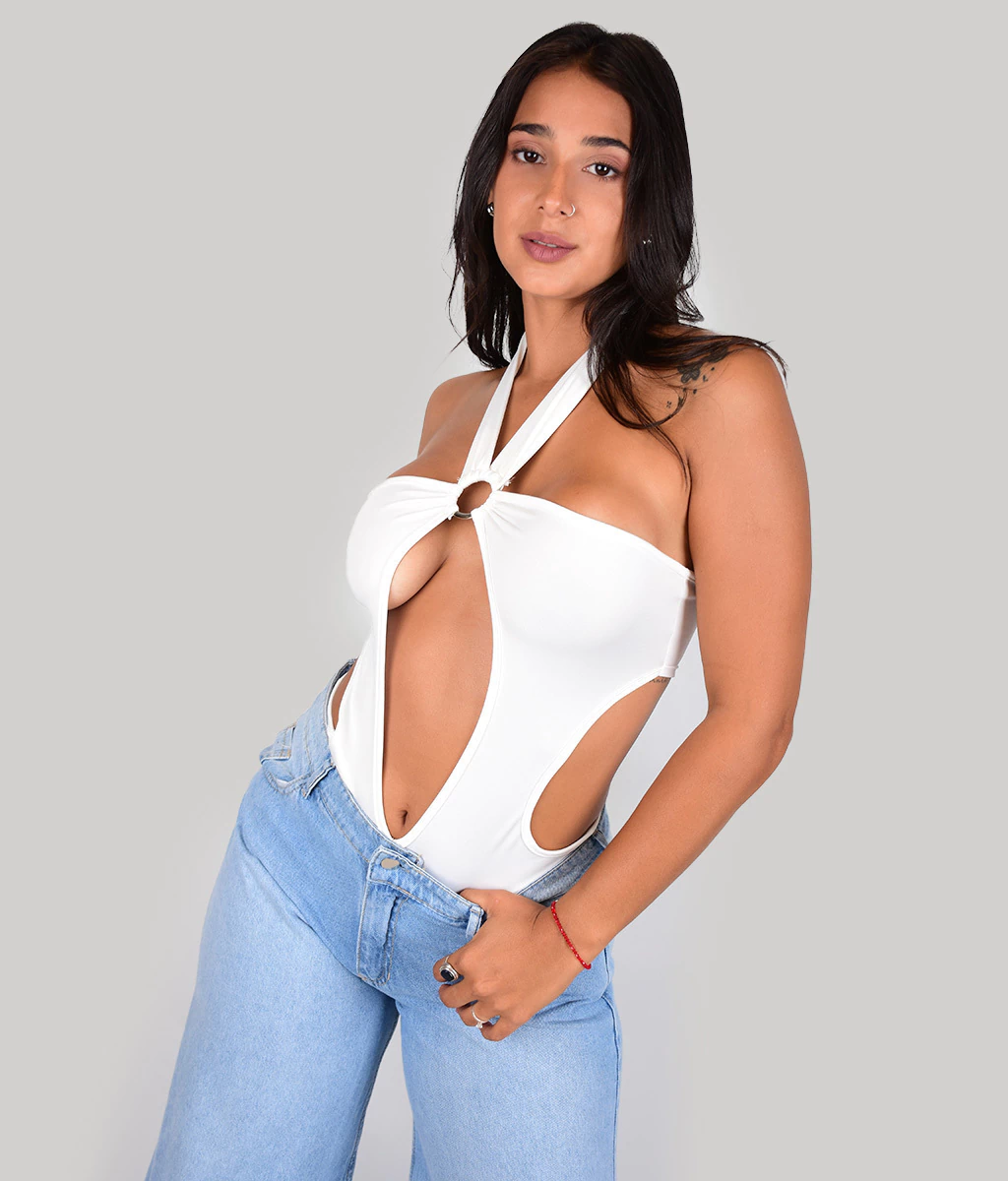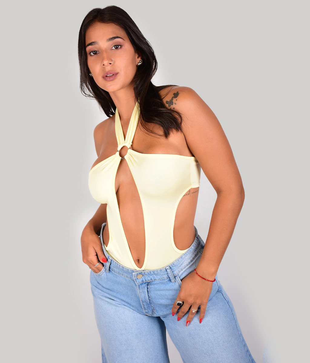 BODY DE MICROFIBRA CON ARANDELA EN ESCOTE Y LAZO PARA ATAR EN CUELLO.