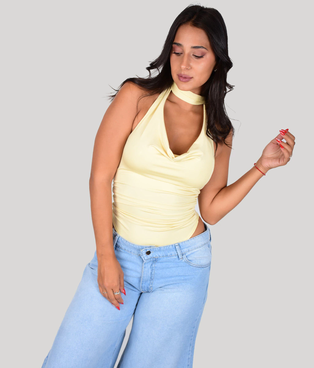 BODY DE MICROFIBRA CON ESCOTE BUCHE Y LAZO PARA ATAR EN CUELLO.