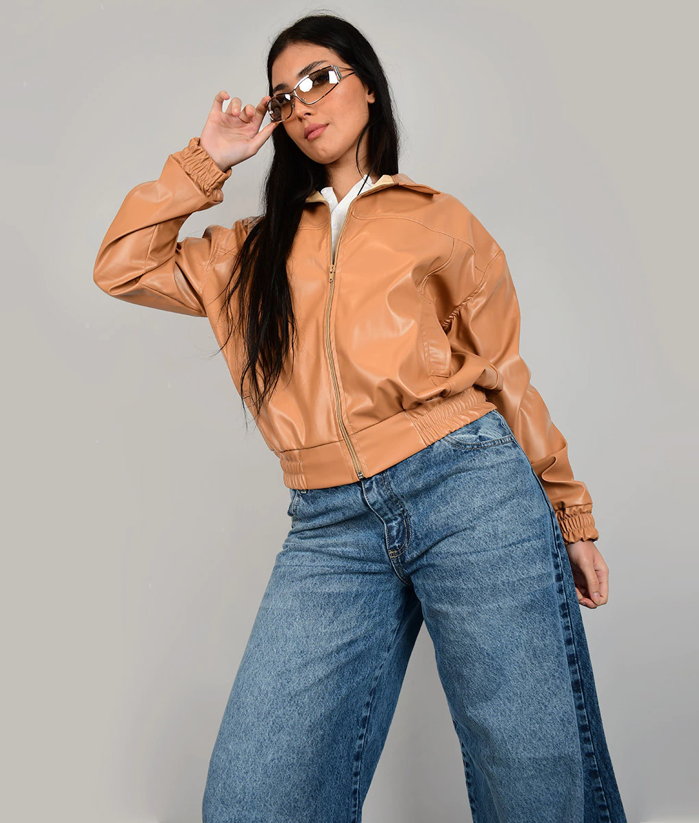 CAMPERA ENGOMADA CON CIERRE AL FRENTE Y BOLSILLOS.