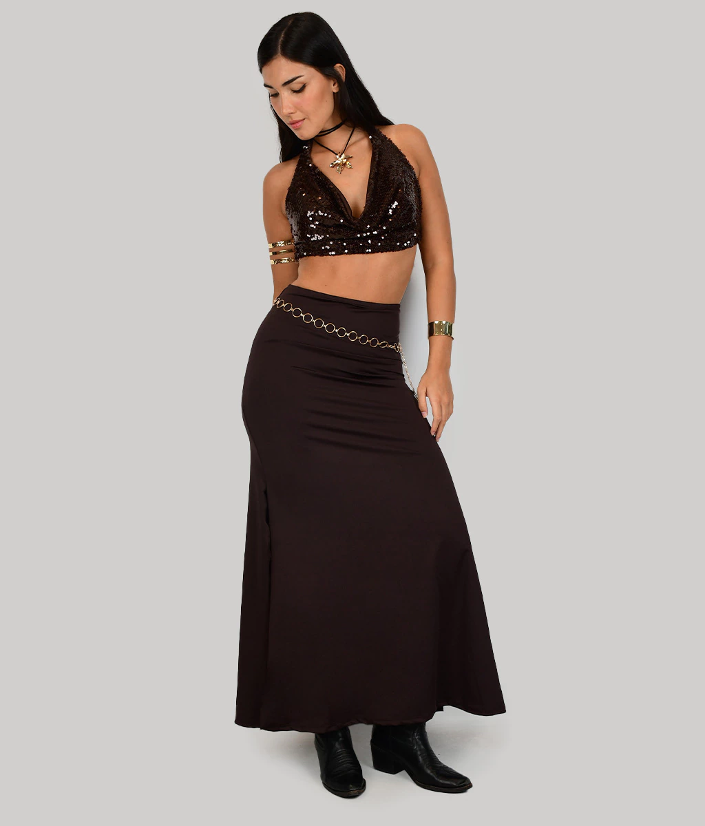 FALDA DE MICROFIBRA CON ELASTICO EN CINTURA Y TAJO A LOS LADOS.