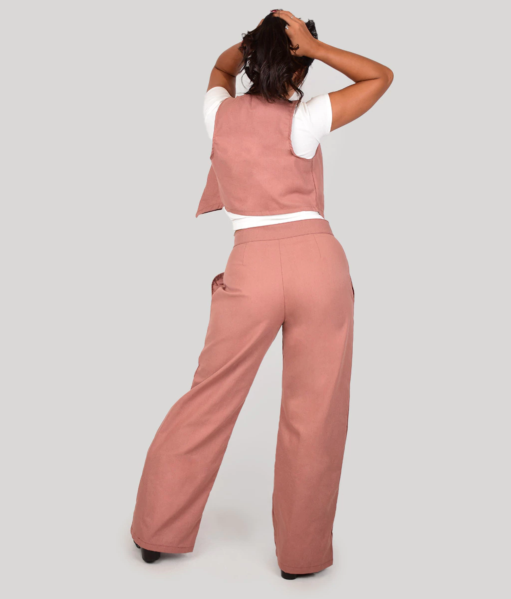 PANTALÓN DE LINO CON BOTON, CIERRE AL FRENTE Y PINZAS A LOS LADOS.