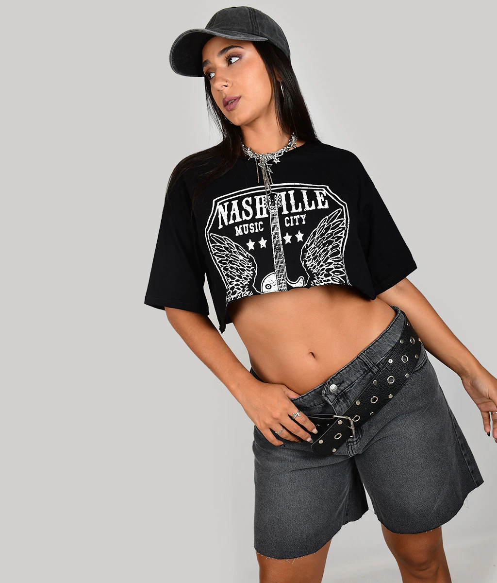 REMERA CROP MANGAS CORTAS DE ALGODÓN CON ESTAMPA AL FRENTE Y CUELLO REDONDO.