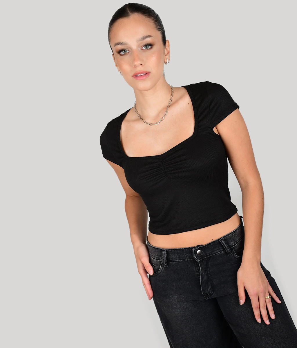 REMERA MANGA CORTA DE MORLEY CON FRUNCE EN ESCOTE.