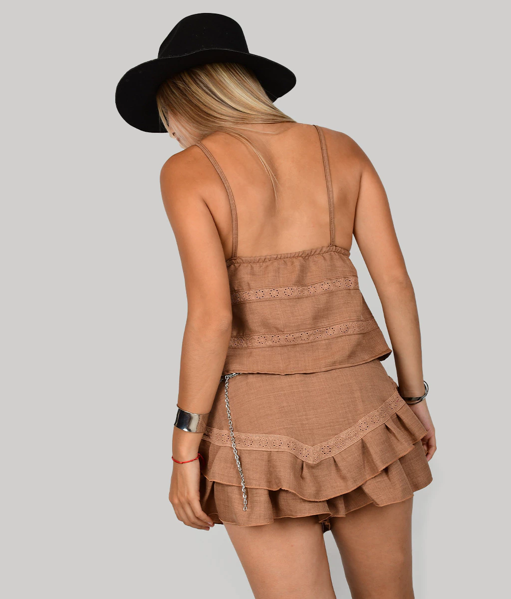 SKORT DE BRODERIE CON ELASTICO EN CINTURA Y TERMINACION EN VOLADOS.