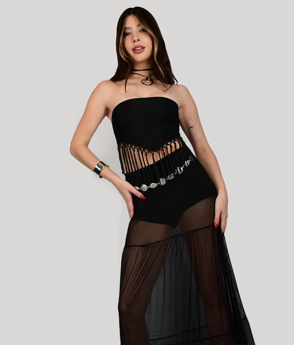 STRAPLESS DE MICROFIBRA CON FLECOS AL FRENTE Y TERMINACION EN PICO.