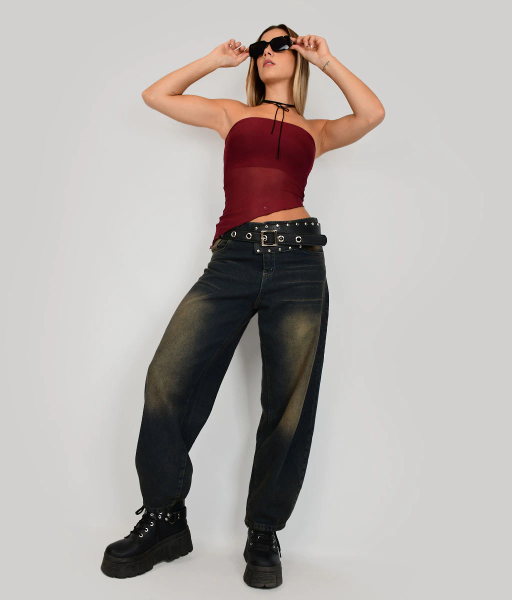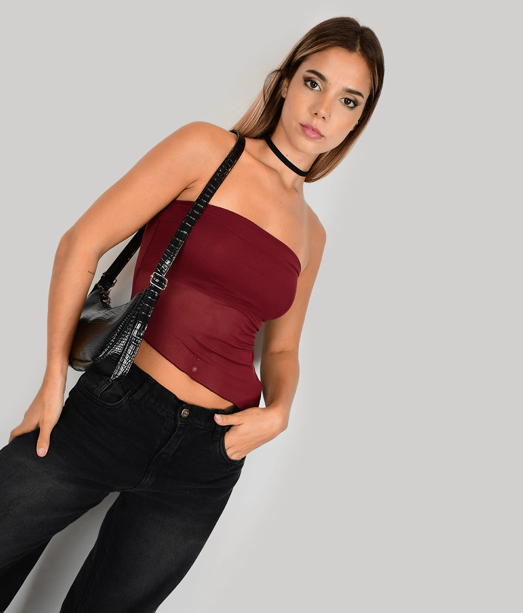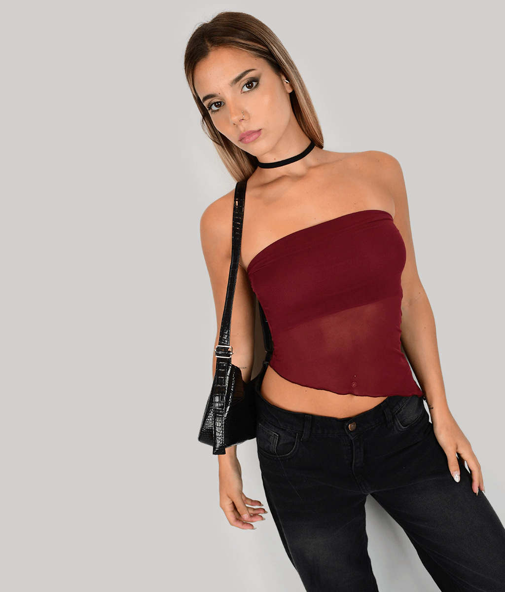 TOP STRAPLESS DE MICROTUL CON TERMINACIÓN EN PICO.