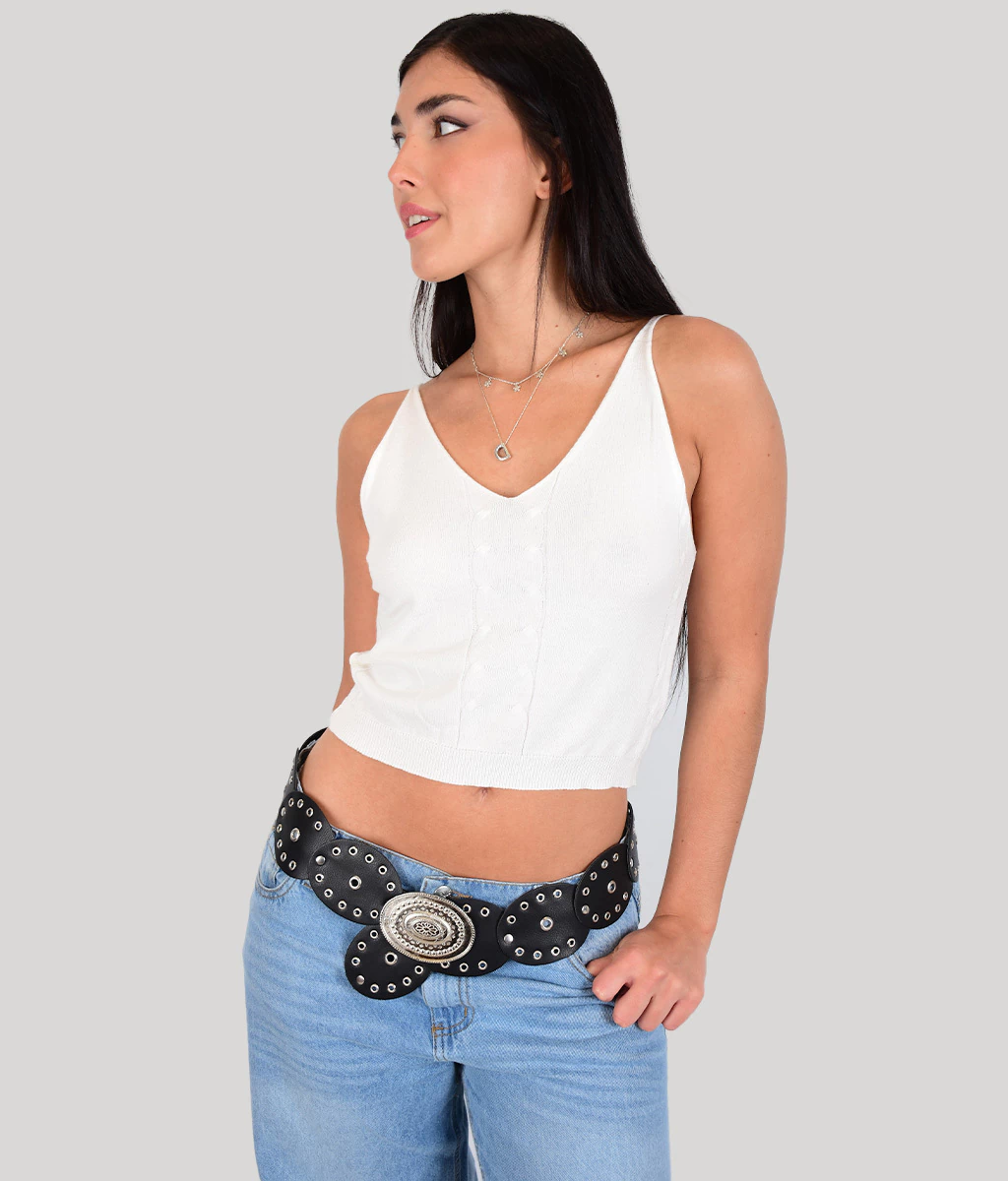 TOP DE HILO CON TRAMADO AL FRENTE, ESCOTE EN V Y BRETEL FINO.