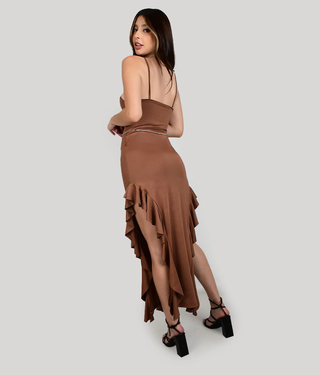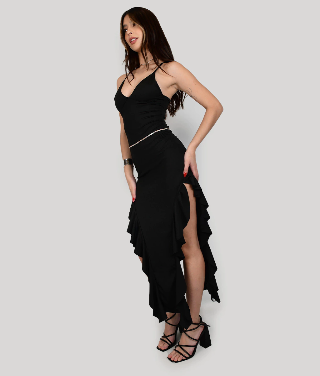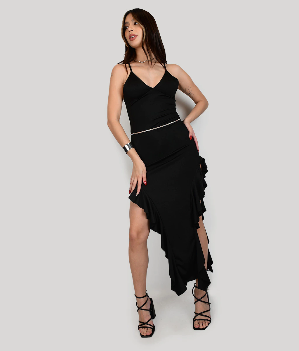 VESTIDO DE MICROFIBRA CON ESCOTE EN V, BRETEL FINO Y TERMINACION VOLADOS.