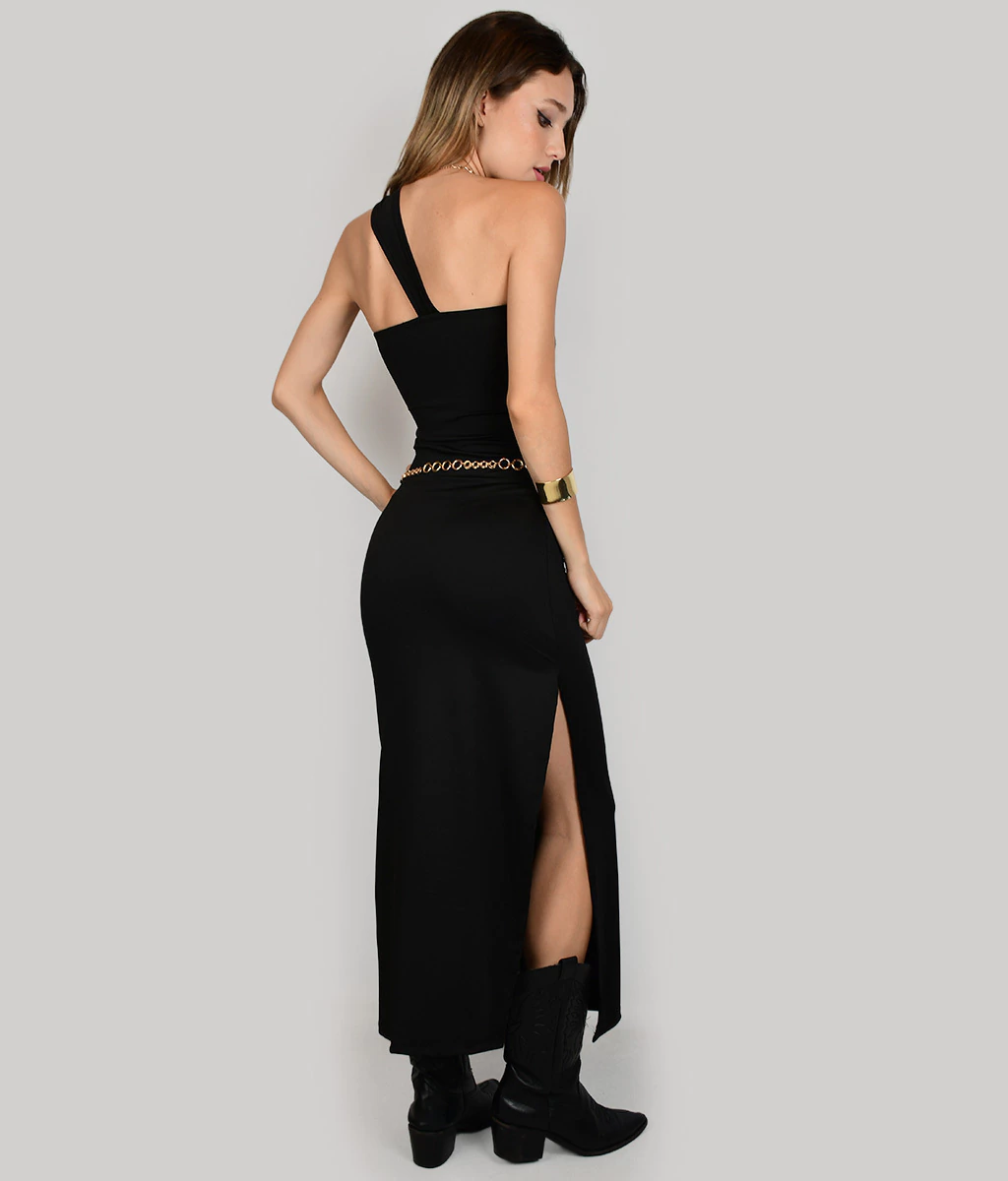 VESTIDO DE MICROFIBRA LARGO CON NUDO EN ESCOTE, LAZO Y TAJO A UN LADO.