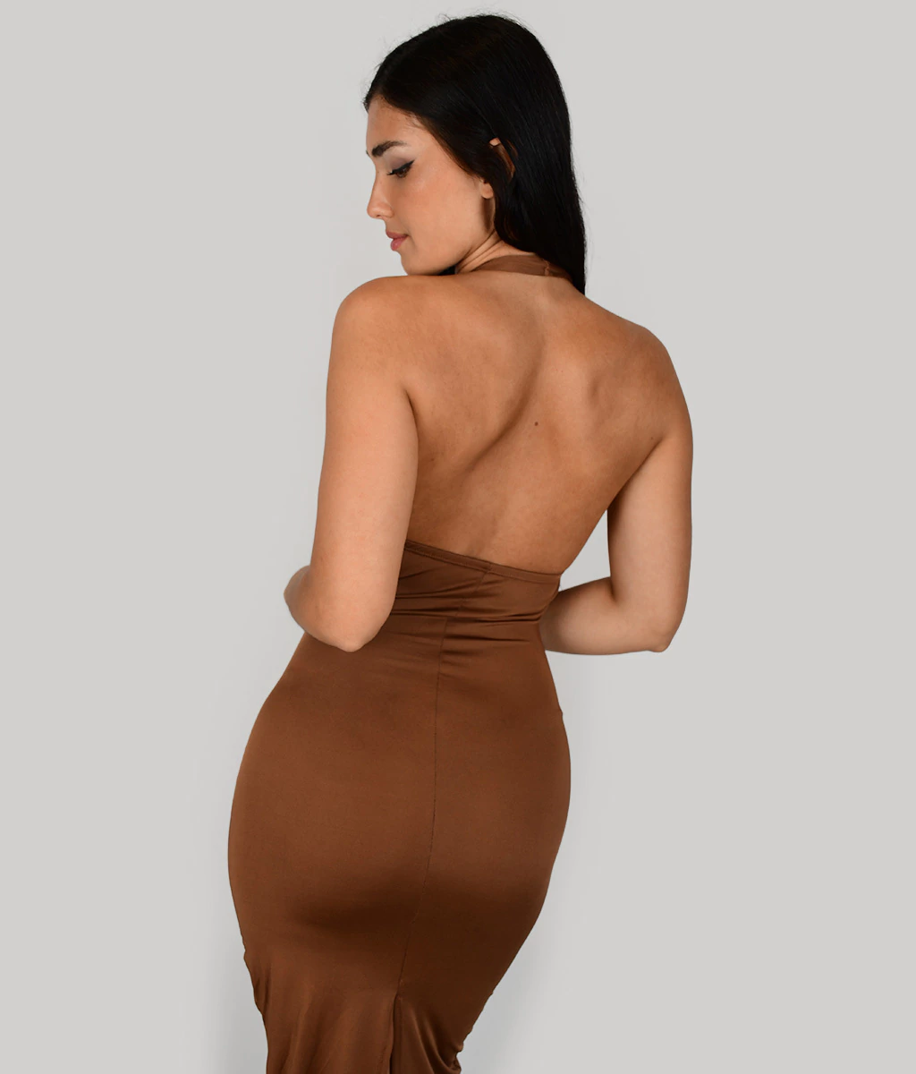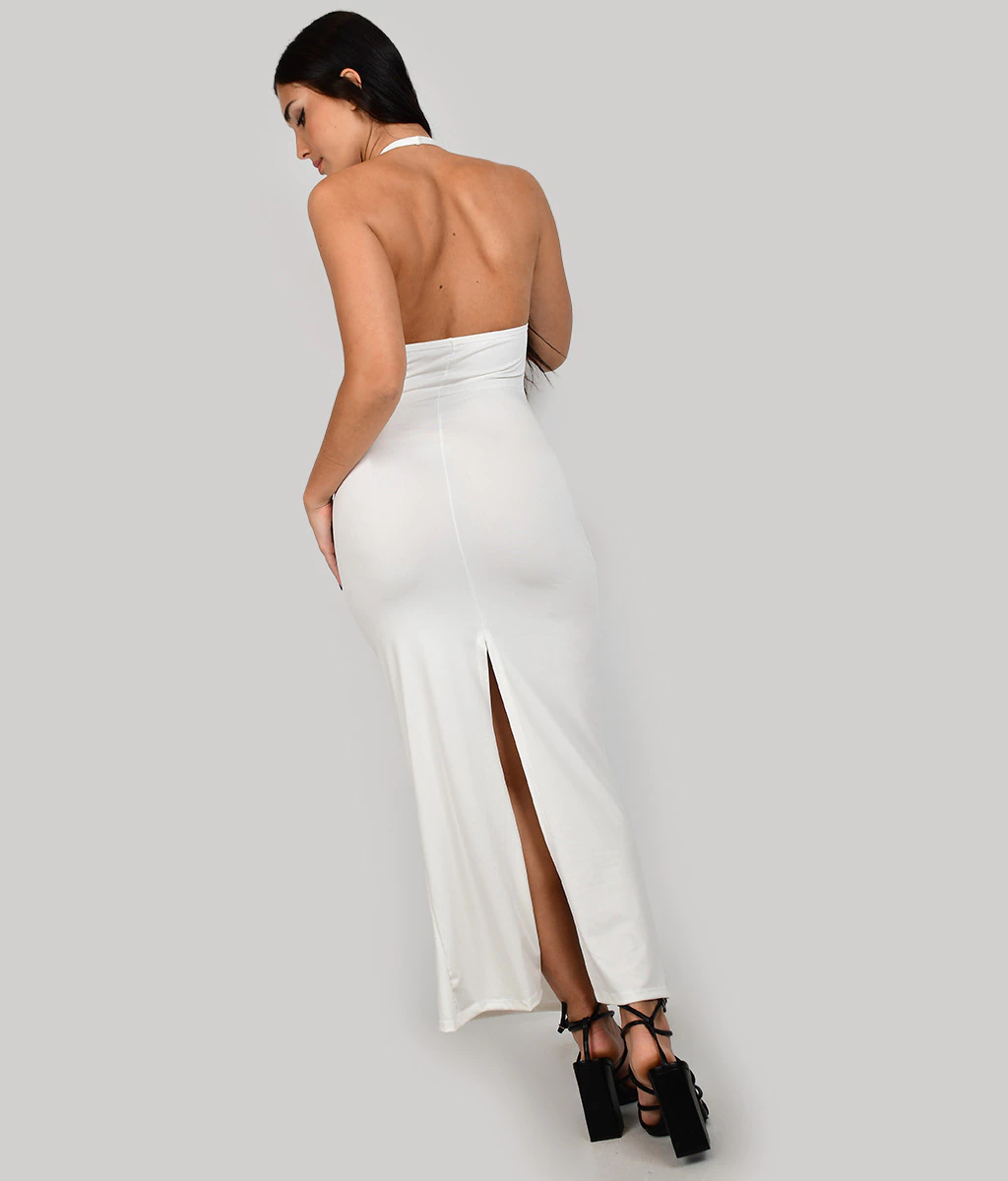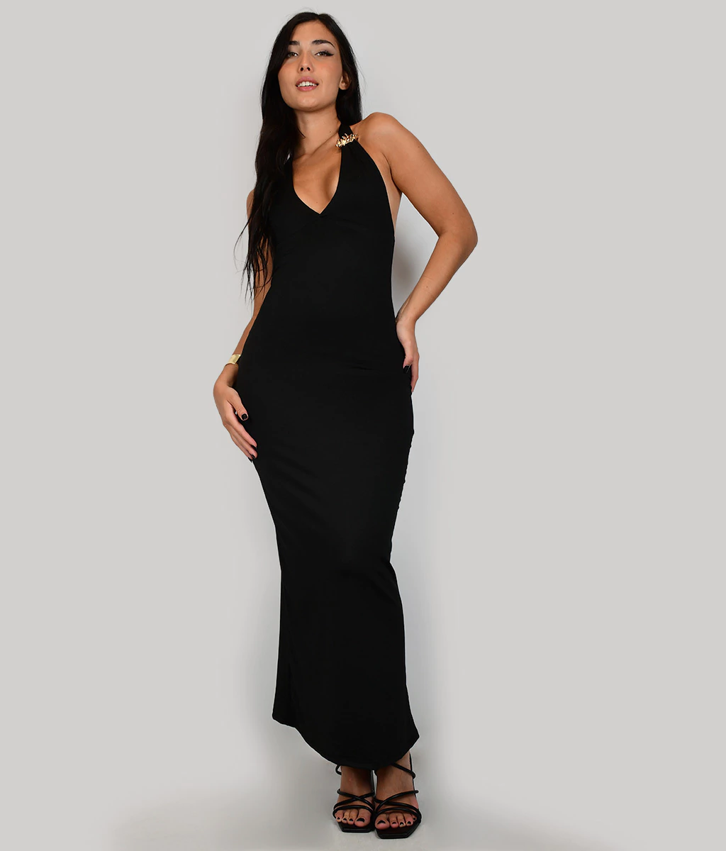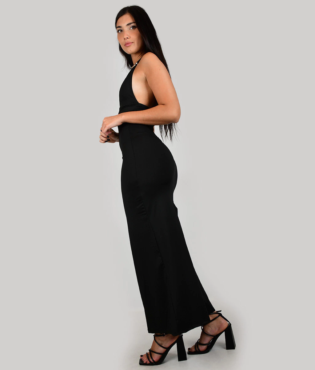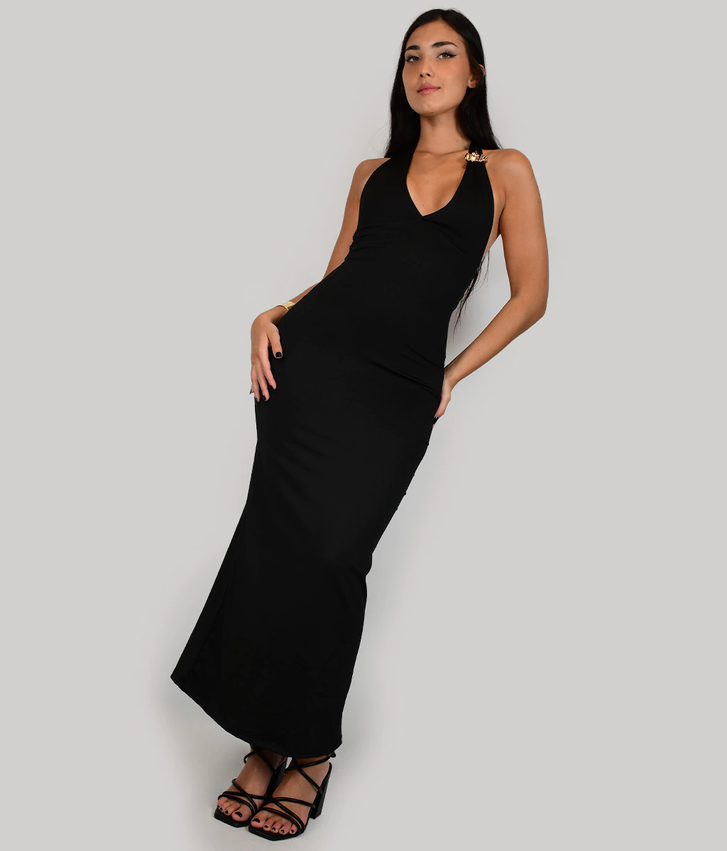 VESTIDO HALTER DE MICROFIBRA CON ESCOTE EN V, APLIQUE A UN LADO Y TAJO EN LA PARTE TRASERA.